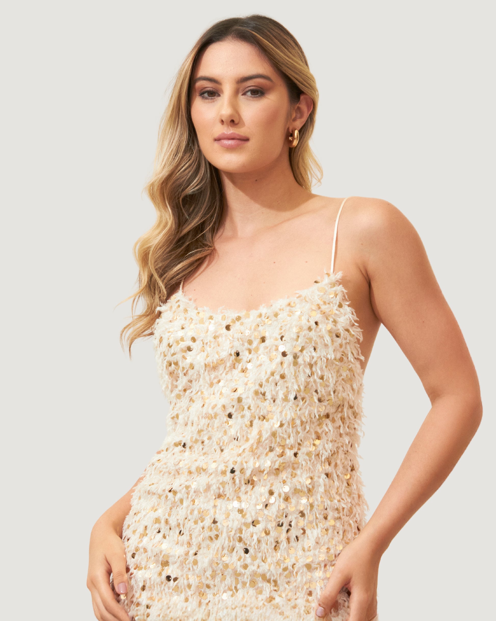 Vestido curto frente única confeccionado em tecido com aplicação de penas e paetês, criando uma rica textura. A modelagem segue reta com leve estrutura, enquanto a alça elástica assegura sustentação confortável sem interferir no desenho da peça. Forro interno em poliéster para garantir conforto e estabilidade ao vestir. Confeccionado em poliéster e poliamida. Ideal para festas, eventos noturnos e celebrações onde a peça precisa ser protagonista.