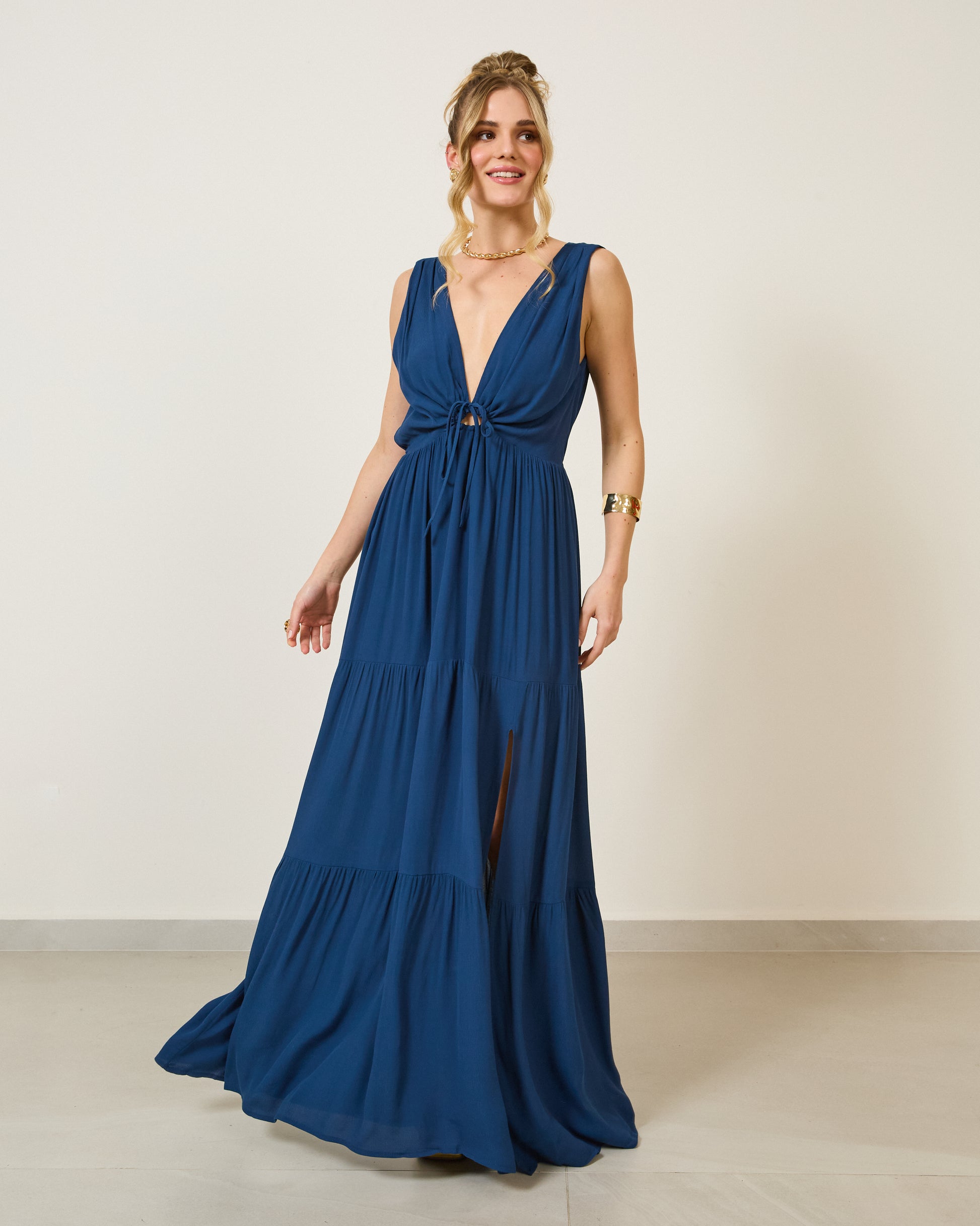 Vestido longo em viscose com forro, decote V com amarração, três marias e fenda frontal. Ideal para festas, jantares e ocasiões casuais sofisticadas.