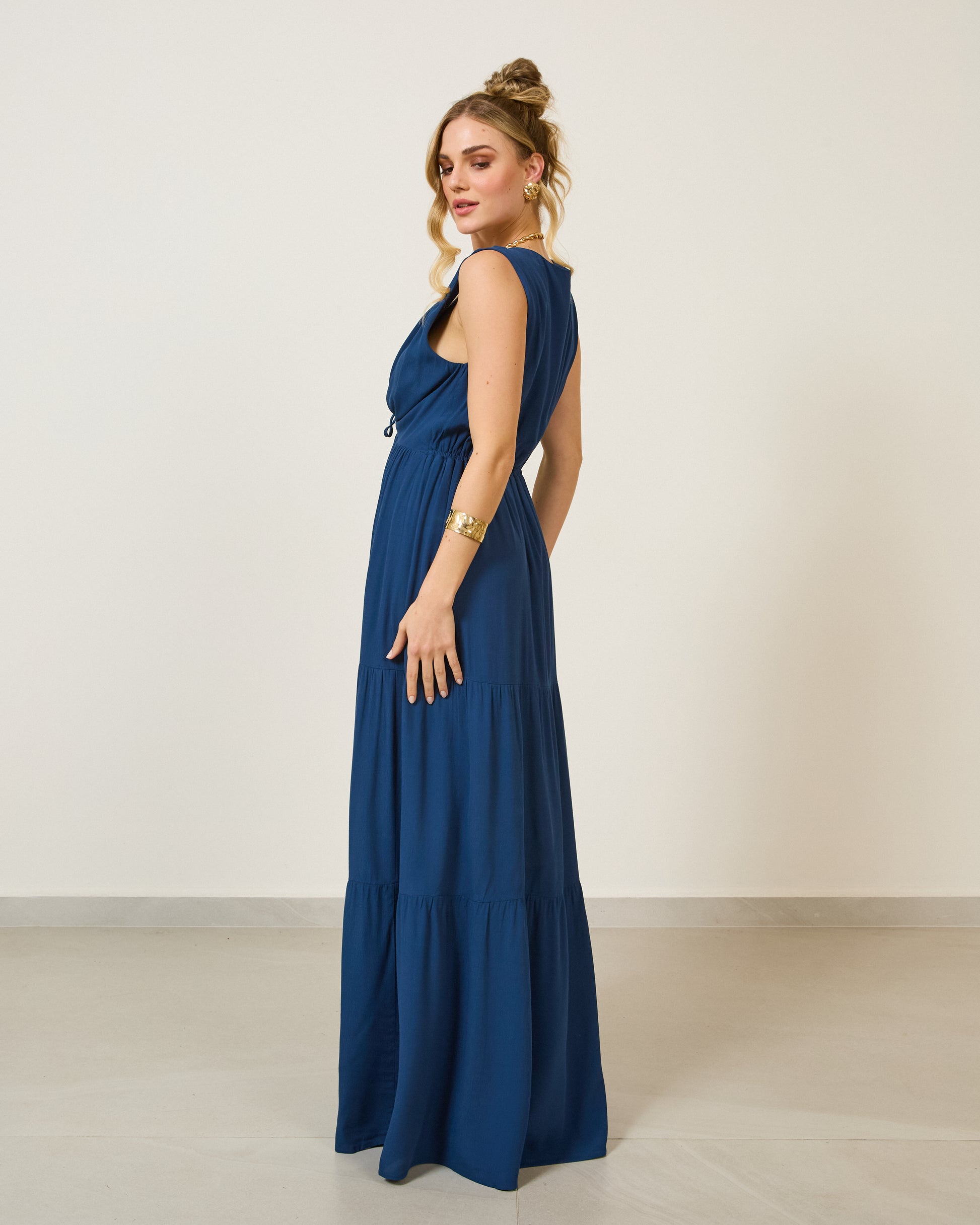 Vestido longo em viscose com forro, sem mangas, decote V profundo com amarração frontal. Cintura com elástico embutido. Saia em três marias com fenda frontal para melhor mobilidade e efeito de movimento. Indicado para festas ao ar livre, jantares e eventos casuais sofisticados.