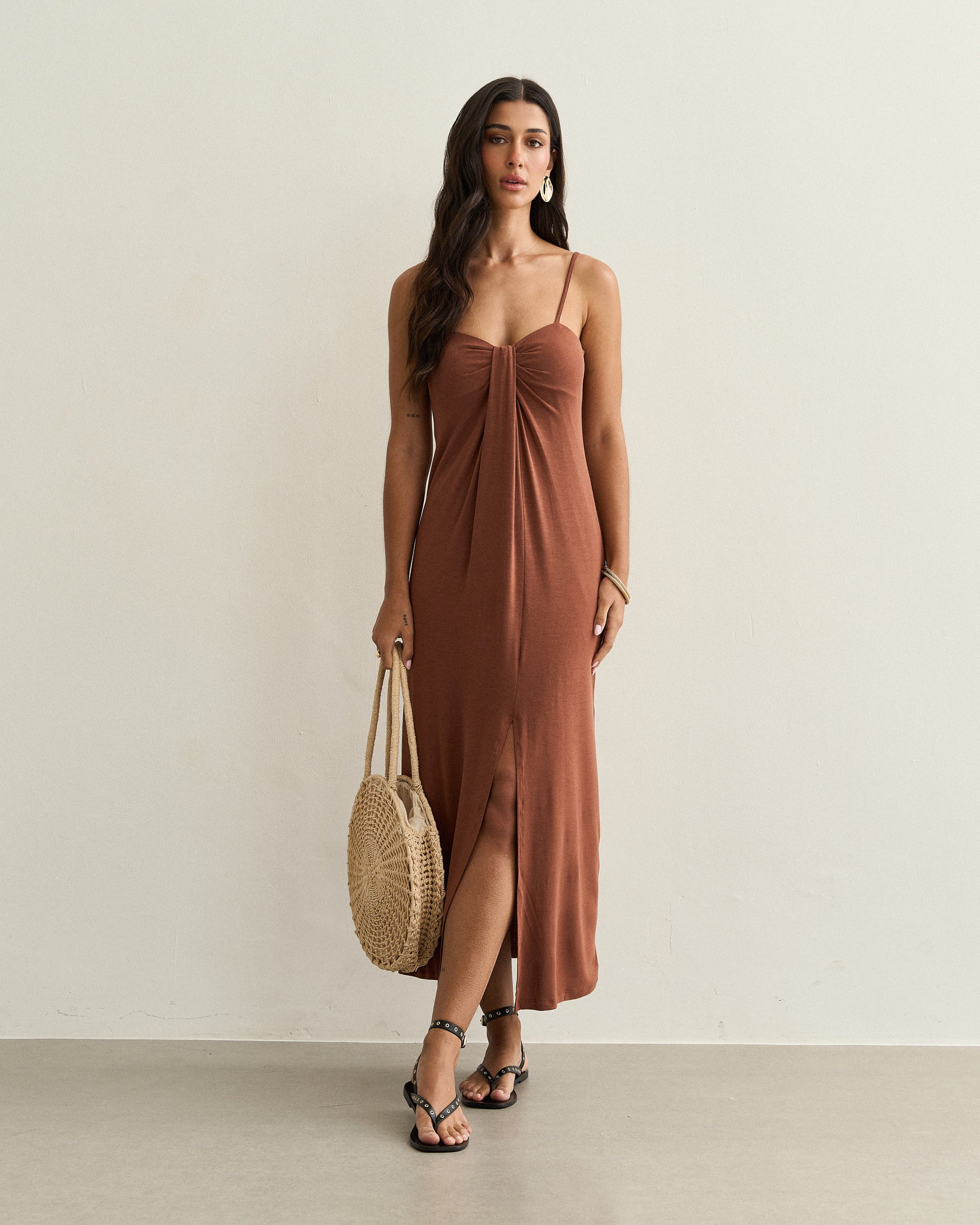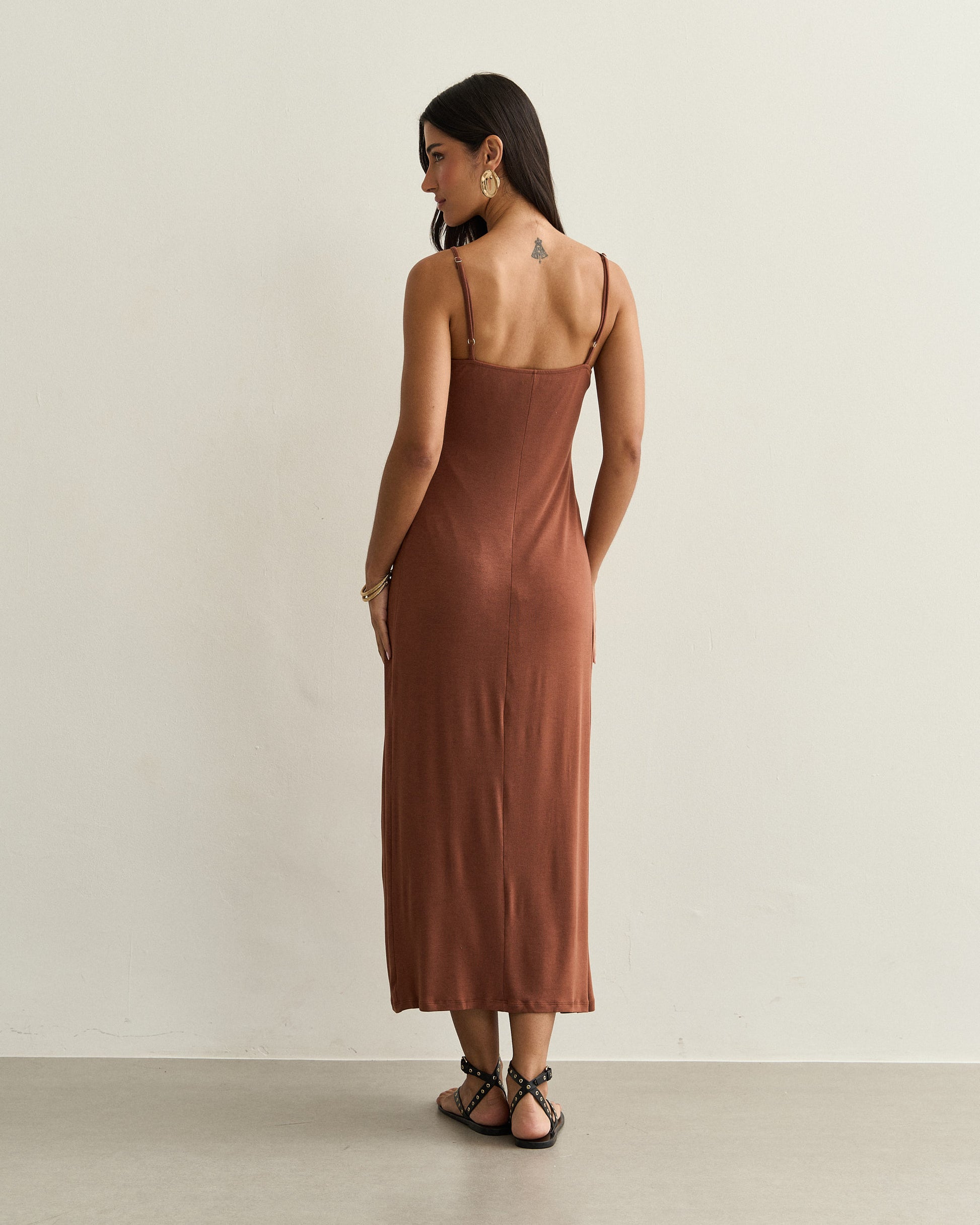 VESTIDO MIDI DETALHE DECOTE MARROM