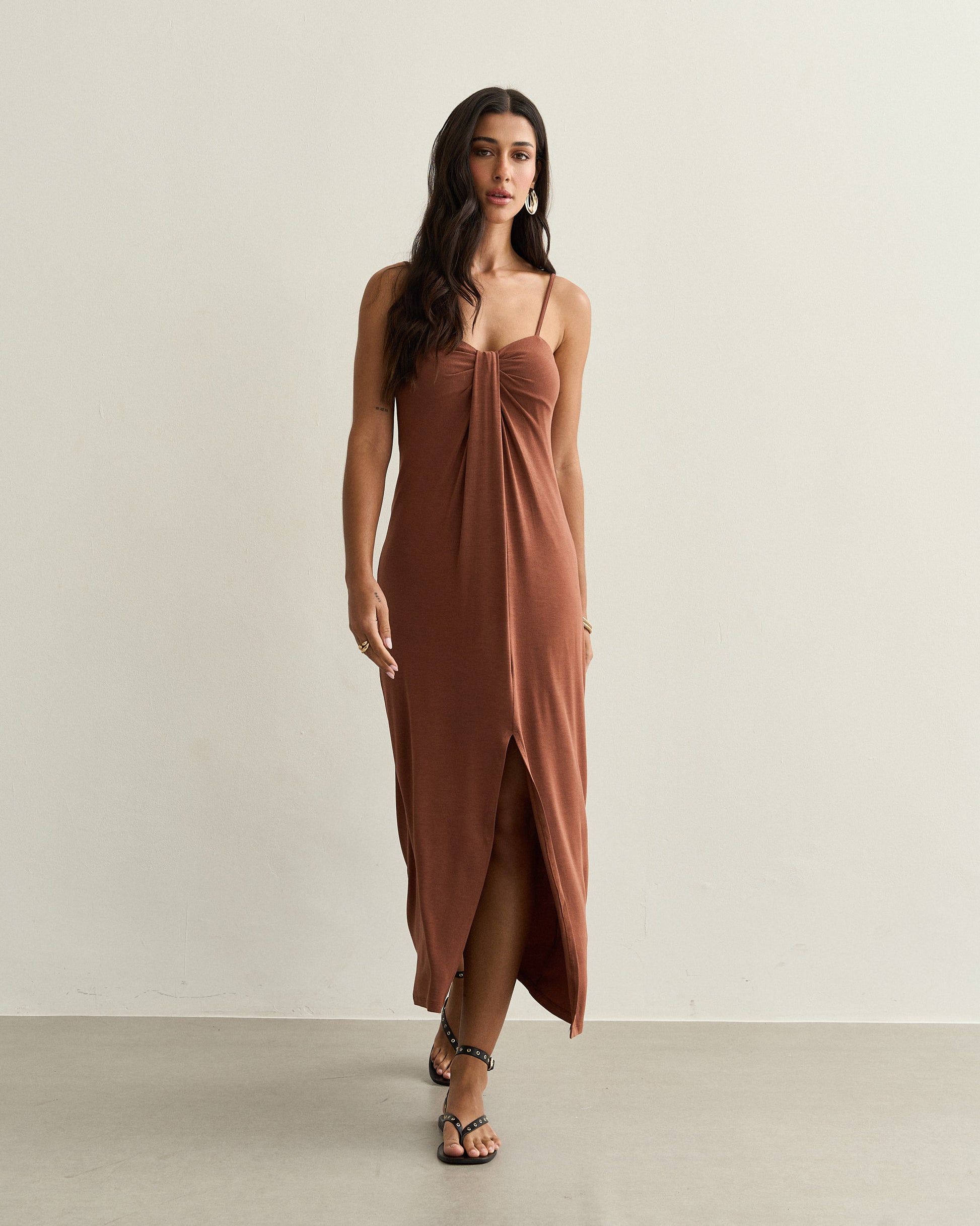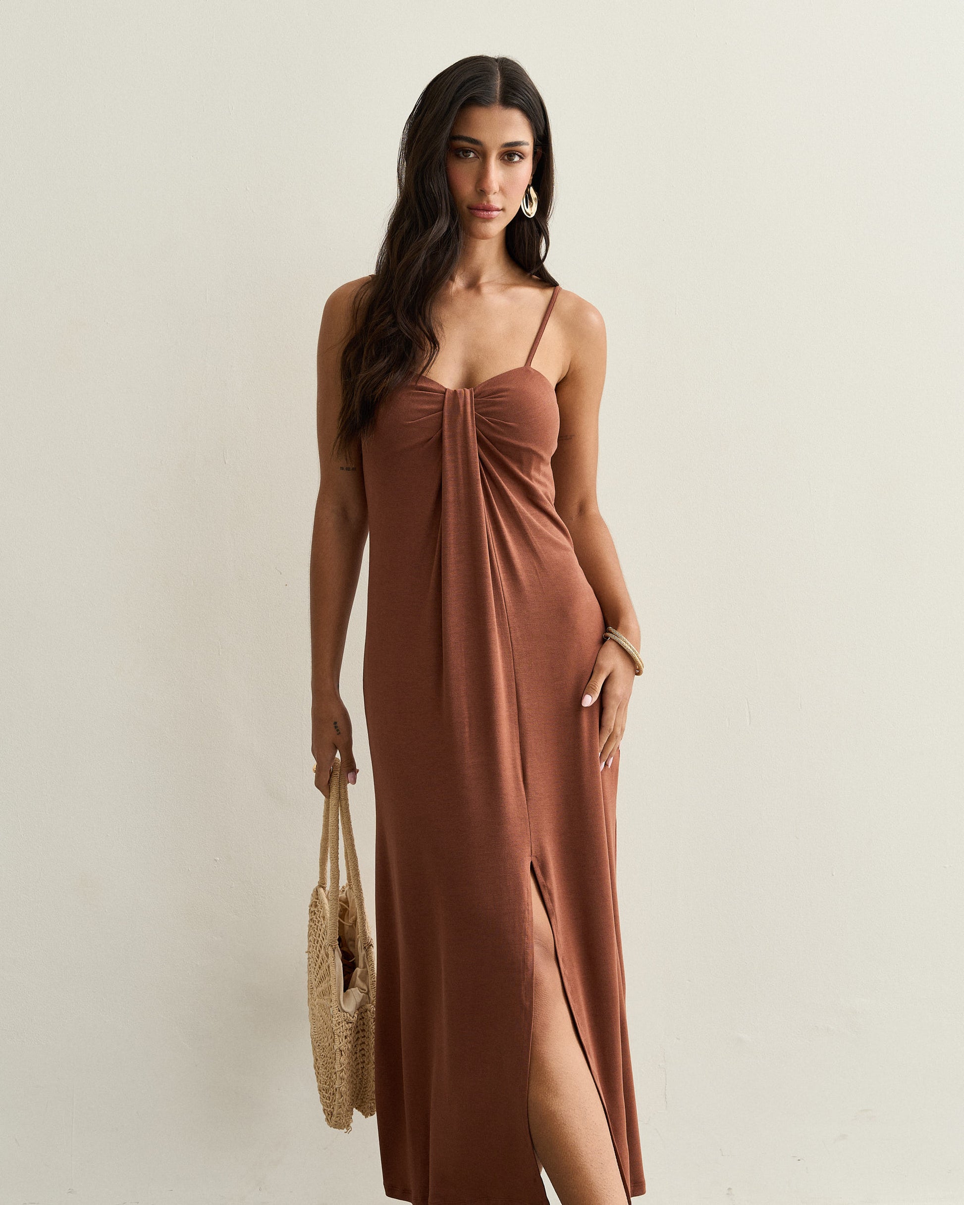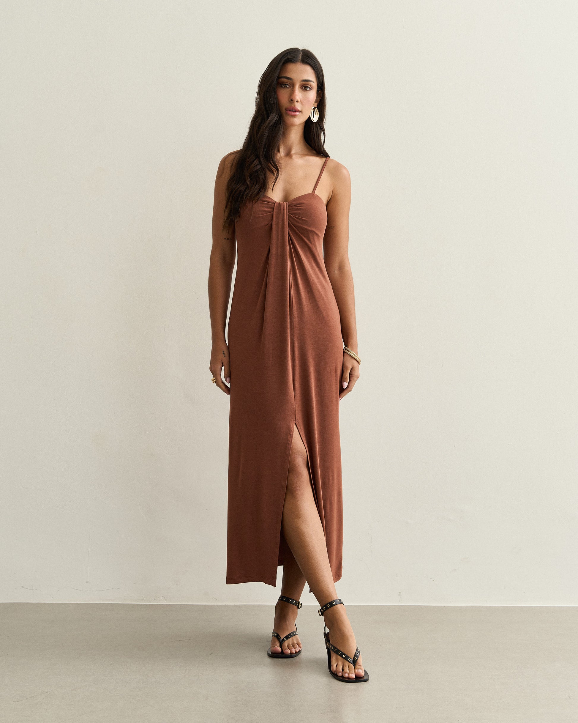 Vestido longo com franzido frontal e fenda discreta. Modelagem reta e fluida que valoriza o corpo com leveza e elegância.