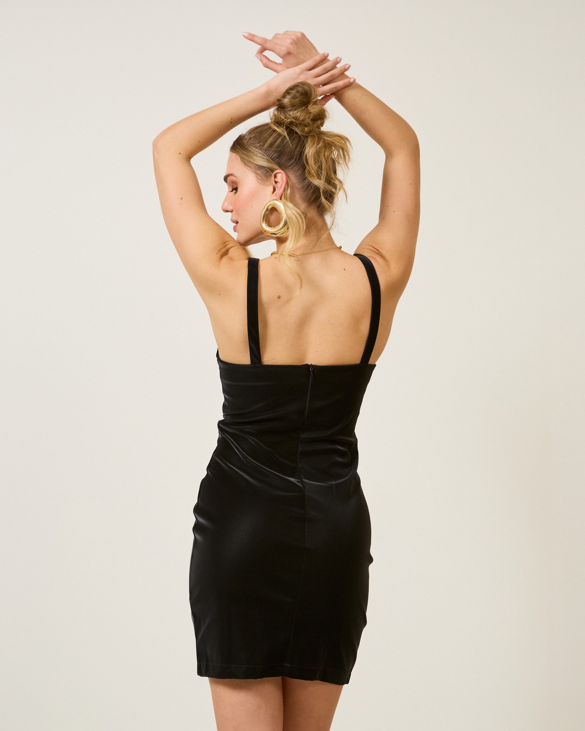 Vestido curto em poliéster com forro interno. Possui alças largas, decote reto e modelagem ajustada ao corpo. A barra conta com fenda frontal discreta que facilita a mobilidade e complementa o design da peça. Indicado para jantares, festas ou eventos sociais.